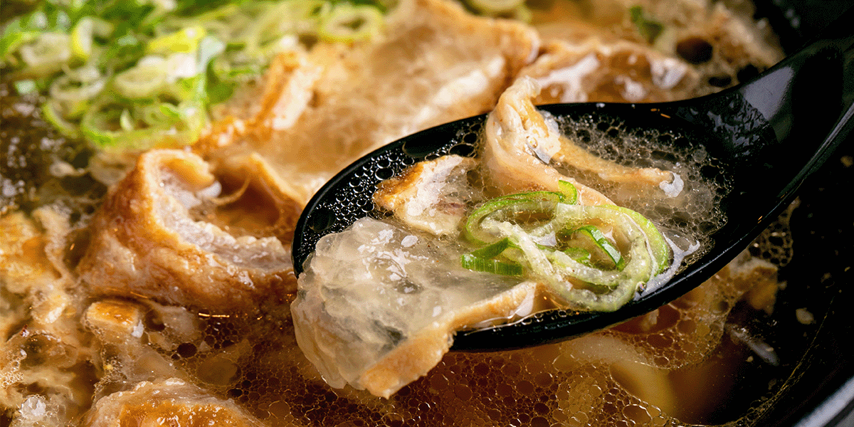 Osaka residents love “Kasu Udon” noodles topped with deep-fried beef offal.